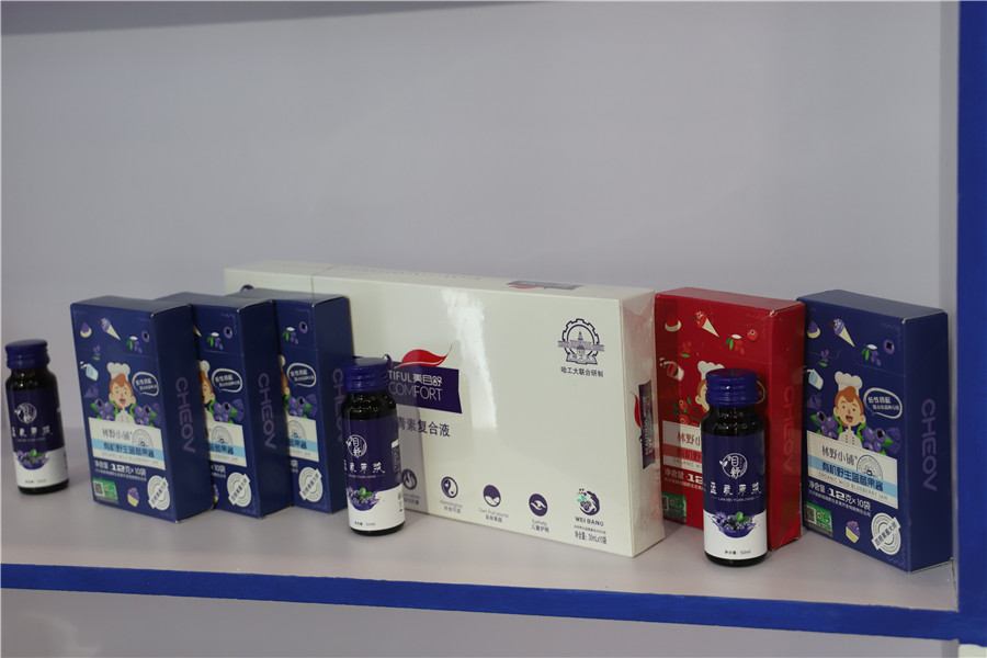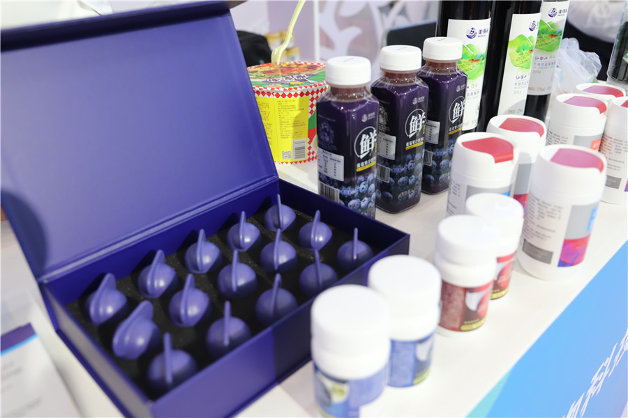 怀宁县的蓝莓综合展区展出的是蓝莓酒、蓝莓复合液、蓝莓花青素、蓝莓果醋等产品。为大力发展蓝莓产业,怀宁县引进浙江蓝美、上海昌荣等38家企业落户,着力于蓝莓种植、加工、花青素萃取及化妆品、保健品等高端衍生产品生产。目前,以蓝莓为核心,怀宁县形成包括良种繁育、规模种植、预冷保鲜、食品加工、休闲农业、乡村旅游等产业、业态,实现三产融合。蓝莓产业已成为县域经济支柱性主导产业,在乡村振兴、经济发展中发挥显著作用。