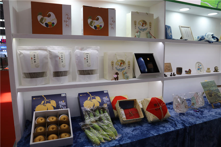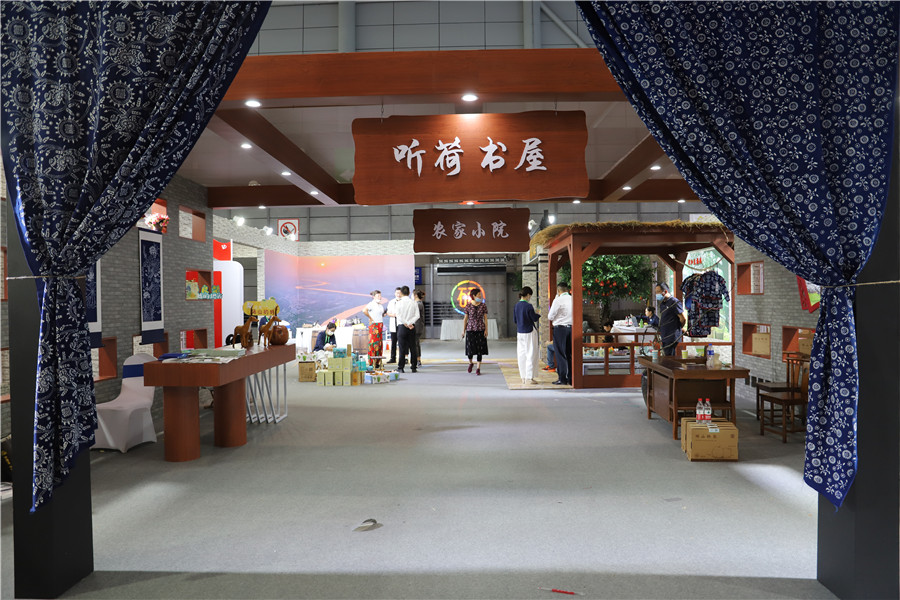 长丰县杨庙镇马郢社区的展架上摆着扎染布、纸灯、陶瓷摆件、玉米、梨等产品,旁边是村容村貌模型。2019年,马郢社区创新采用“合作社+创客”的模式成立马郢乡村旅游合作社,围绕农业增产、农民增收目标,大力发展文旅项目和田园综合体项目,将马郢打造成为农村生产生活生态“三生同步”、一二三产业“三产融合”、农业文化旅游“三位一体”的特色文旅乡村。“马郢社区从零游客到今天辐射合肥及周边地市,带动了40户困难群众脱贫,累计接待游客70万人次,累计带动村民收入约580万元。”工作人员倪梦婷介绍道。