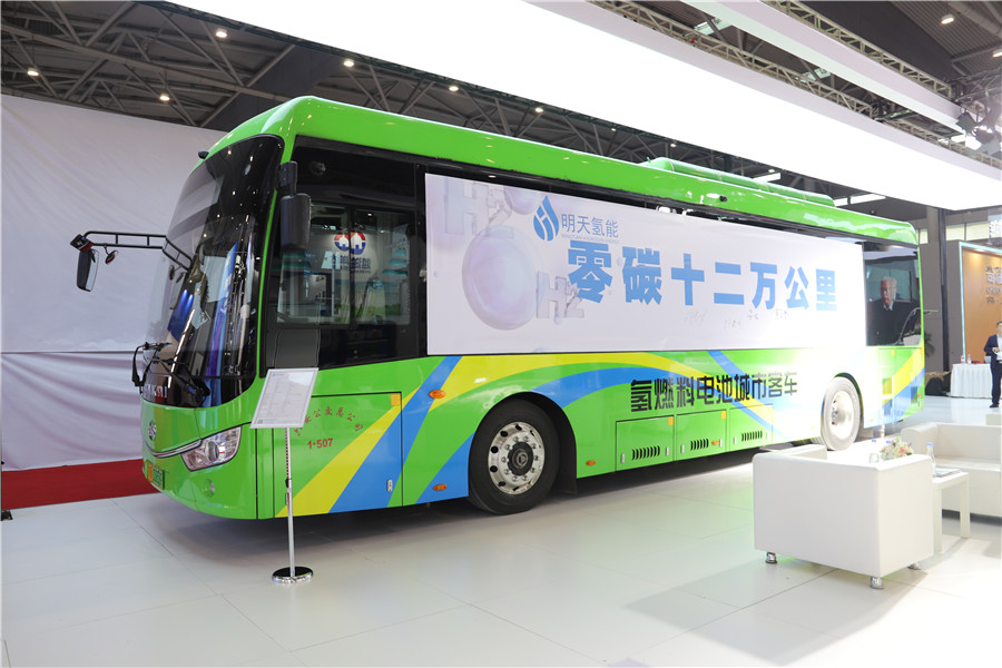 氢能是高效低碳的二次能源、是绿色清洁的工业原料,是实现碳达峰、碳中和的重要媒介。明天氢能股份公司展示了一台氢能公交车。2019年12月,安徽首批搭载明天氢能燃料电池系统的公交在六安公交线路上正式运行,填补了省内燃料电池公交的空白。这些公交车具备低氢耗、续航里程长等优势,8.5米车型平均能耗为百公里4.5公斤,10.5米车型平均能耗为百公里5公斤。