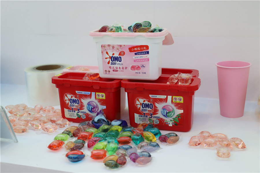 安徽鼎洋生物基材料展台上放着的凝珠水溶膜是一种环保包装材料,在生产过程中添加秸秆纤维、聚乙烯醇。该公司工作人员徐浩告诉记者:“把这种膜制成的洗衣凝珠放进洗衣机,可以很快溶于水,方便环保,且比普通洗衣粉、洗衣液清洁力更强。”