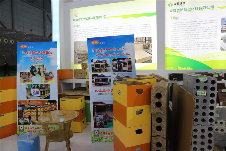 阜阳宏桥秸秆科技有限公司今年带来了秸秆板材、秸秆建材和秸秆物流托盘三款主打产品。该公司以麦(稻)秸秆为原料生产出零甲醛秸秆板材,每年利用秸秆6万吨左右。“这种板材具备多种优点,既有塑料的韧性又有木材的可降解性。”该公司董事长张中成介绍,“在上海进博会,我们的秸秆原料产品广受欢迎,签订了几百万的订单。”