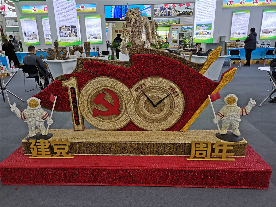 安徽红方工艺品有限公司展出了《建党100周年》等一系列秸秆工艺品。该公司立足于岳西县的丰富木本经济作物资源,将瓜蒌藤、高粱秸秆等变废为宝,生产出大量节庆用品和家居装饰品,如屏风隔断、灯具家具等。该公司工作人员秦六萍介绍,公司已研发出不同风格的20多个系列近三千余款产品,主要出口欧美国家,每年综合利用的秸秆能达到800多吨。