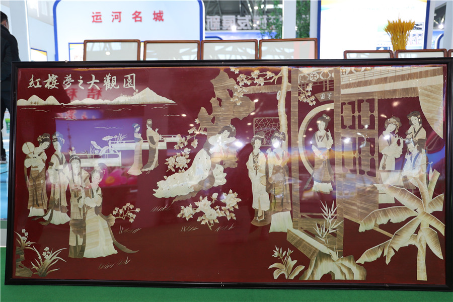 萧县凯振农作物种植农民专业合作社的《红楼梦之大观园》麦秆画作品吸引观众驻足。“秸秆画制作工艺复杂,整个过程全凭手工完成。”该合作社负责人孔庆祝介绍,“这幅画需要一个人做半个月以上,能卖到上万元。”该合作社的麦秆画颇受市场欢迎,每年的销售额有八九百万元。在此基础上,汝南县锦玉麦草画工艺品有限公司拓展了麦草画艺术形式,生产私人订制背景墙、屏风、家具等精美拼花系列产品,远销海外。