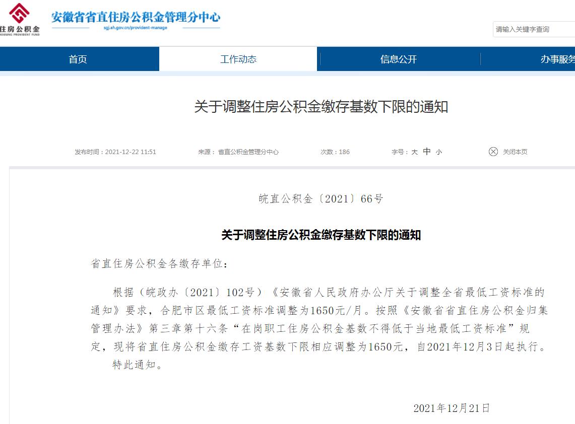 通知称,根据(皖政办〔2021〕102号)《安徽省人民政府办公厅关于调整全省最低工资标准的通知》要求,合肥市区最低工资标准调整为1650元/月。按照《安徽省省直住房公积金归集管理办法》第三章第十六条“在岗职工住房公积金基数不得低于当地最低工资标准”规定,现将省直住房公积金缴存工资基数下限相应调整为1650元,自2021年12月3日起执行。