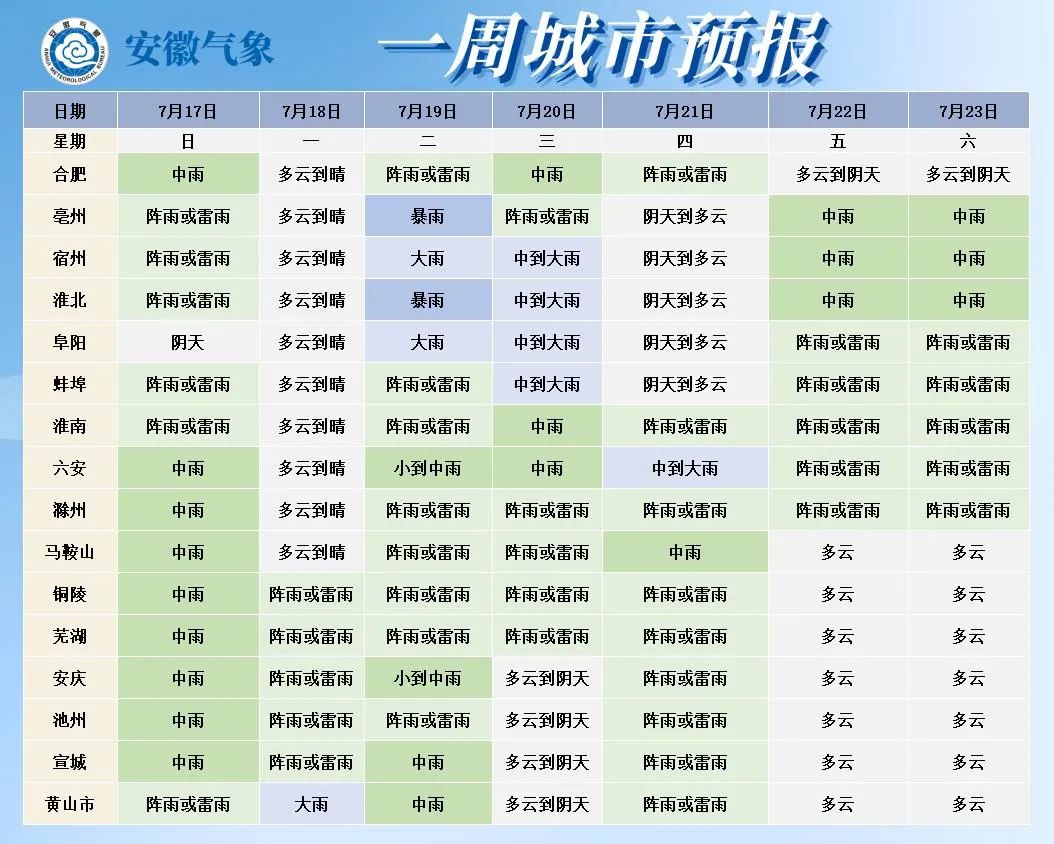 17日(周日):淮北地区阴天转多云,大部分地区有阵雨或雷雨;淮河以南有中等阵雨或雷雨,部分地区大雨,局部暴雨。