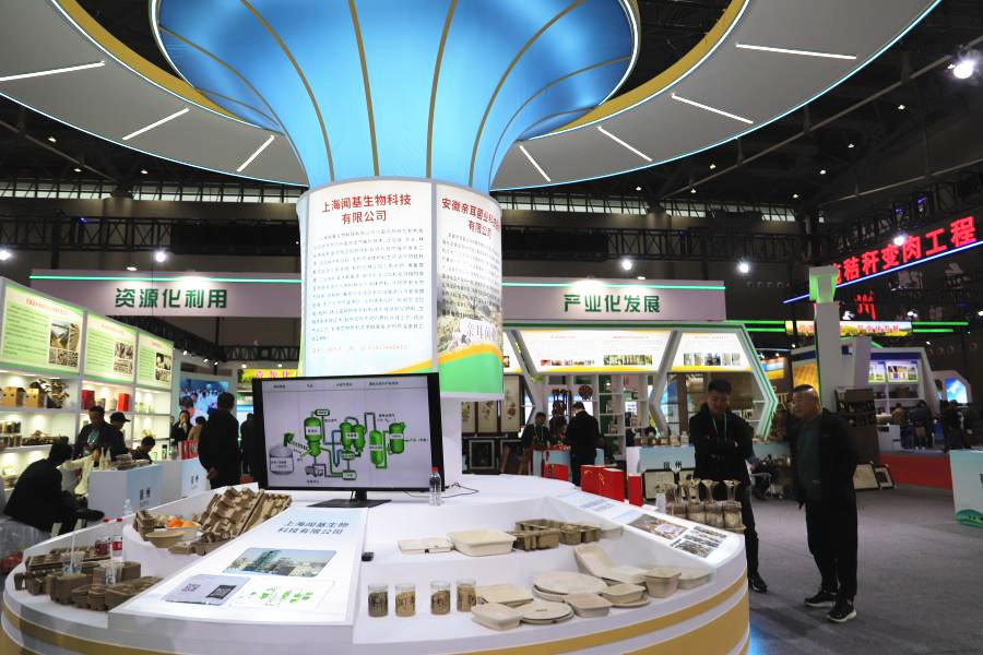 “生物新材料 万物秸秆造”,这是安徽丰原集团有限公司喊出的口号,服装、餐具、皮革椅、口罩、墙板……展厅内秸秆制品琳琅满目。其中,该公司带来了秸秆制糖和生物基材料工程最新科技成果——“秸秆混合糖联产黄腐酸高效有机肥技术”,国内首个年处理1.5万吨级秸秆制糖联产有机肥项目正在运行。现场工作人员陈雨介绍,该公司计划以分布式乡镇糖厂的模式,在乡镇建立混合糖和有机肥加工厂。“每8至9吨农作物秸秆作为原料,可以生产3吨混合糖,同时联产5吨黄腐酸高效有机肥。”这种有机肥可以用于种植蔬菜、水果等,还可改善土壤。此外,混合糖生产聚乳酸至聚乳酸下游应用等产业链集群发展,延伸出塑料加工、纺织、工业及家用装饰材料、生物化学品、生物燃料、生物肥料等六大产业集群。