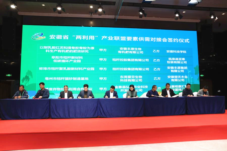 展会期间,还举办了“两利用”产业联盟要素供需对接会,对企业产品、技术及相关金融产品进行重点推介。对接会上,集中发布约70个项目供需信息,参会企业、金融单位、技术体系代表现场签署了10项合作协议。其中,东莞爱芬生物科技有限公司在会上推介的“秸秆猫砂+秸秆猫砂一体化智能装备”为秸秆应用提供了新场景。该公司负责人朱飞介绍,秸秆猫砂具有除湿、去臭、环保等特点,牢牢占据市场半壁江山,今年企业借着博览会准备到安徽发展。他认为,安徽的秸秆利用的工作做得非常好,目前的收储运各个环节的基础条件也非常好,在猫砂落地的环节中就可以形成紧密的连接。“2024年在安徽落地5个工厂,日产量大概是500吨以上。”