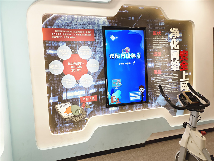 在“阳光校园、拒绝欺凌”展区,参观者骑自行车通过连接屏幕进行答题,所做的题目对应的是各个板块讲解的知识点,可以检测学习成果;在“净化网络、安全上网”展区,参观者可以进行互动式“预防网络犯罪”知识问答,明白“未成年人应当做网络的主人,在上网时要认识到网络不是法外之地”的道理;在“虚拟牢房”展区,参观者可以体验一下违法犯罪之后坠入深渊的感觉;在“法治迷宫”展区,整个展厅学习结束后,参观者可以进行综合测试,在游戏互动中开心答题。