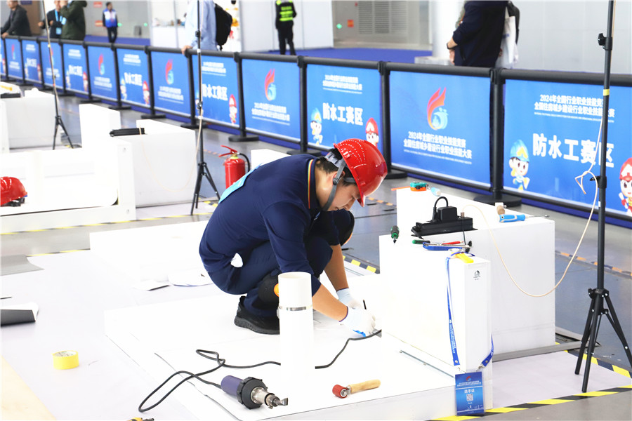 砌筑工赛区,选手们全神贯注地进行比赛,手法娴熟地抹上灰浆,拿起砖块稳稳地放置并抹平,一道道工序有条不紊。经过他们的妙手,一面花式墙面便呈现在人们眼前,在保证速度的同时也保证了精确度。而管工、钢筋工、防水工、建筑信息模型技术员赛项同时开赛,同样精彩纷呈。