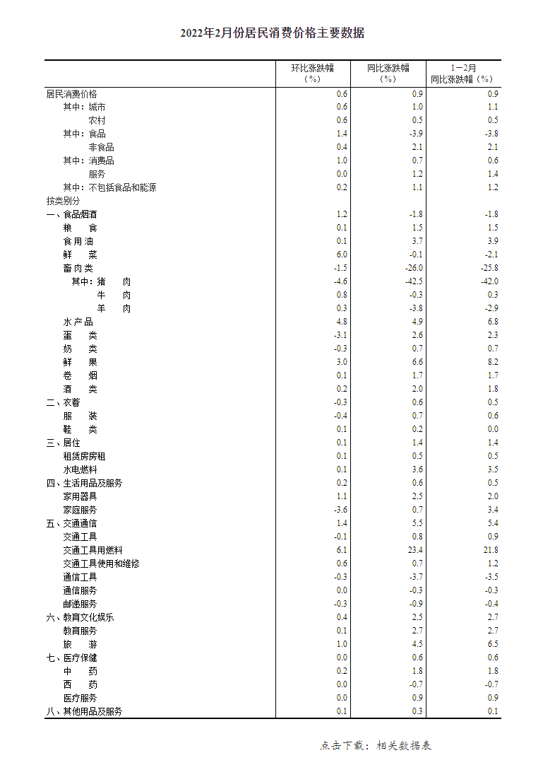 据国家统计局消息,2022年2月份,全国居民消费价格同比上涨0.9%。其中,城市上涨1.0%,农村上涨0.5%;食品价格下降3.9%,非食品价格上涨2.1%;消费品价格上涨0.7%,服务价格上涨1.2%。1—2月平均,全国居民消费价格比上年同期上涨0.9%。