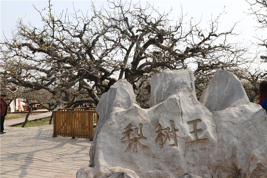 站在梨树王景区入口处的桥上向前望去,满眼都是连绵不断的梨树。这便是砀山酥梨的发源地,占地1200亩。园内超过300年树龄的老梨树有6万多株。一棵老梨树周围已站满合影的游客,这棵树冠直径16米的梨树造型独特,枝干遒劲,年产酥梨2000公斤,不愧“梨树王”之称。