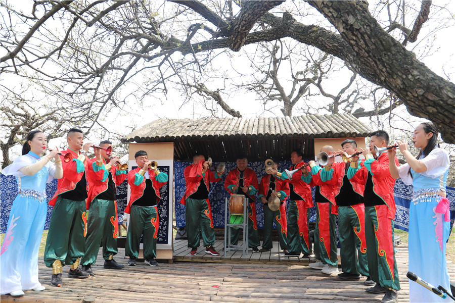 梨园内的一块展板上写着“2019中国砀山梨花艺术节开幕式”以及“3月15日-4月15日”的字样。目前,梨树枝头上刚刚冒出新芽,还未开花,千亩花海是无缘得见了。不过,梨园内的各种热闹活动,还是值得一看。这边,一群穿着红黄相间帅气服装的孩子正在表演激昂的大鼓;那边,砀山唢呐声音清越,砀山四平调唱腔优美,两者皆为国家级非物质文化遗产;这厢,斗羊、斗鸡战况激烈,围观者喝彩声不绝;那厢,书法、面塑等作品展台前围满了人,个个兴致浓厚。