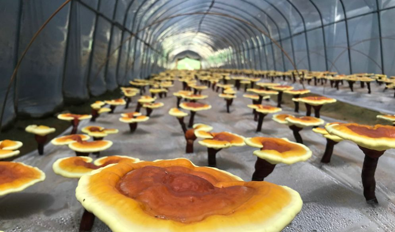 上面光伏板,下面灵芝大棚。大湾村农光互补扶贫电站年发电量28万千瓦,年收益28万元;灵芝大棚8个,一年生产灵芝6万棒,年收入30万元左右。