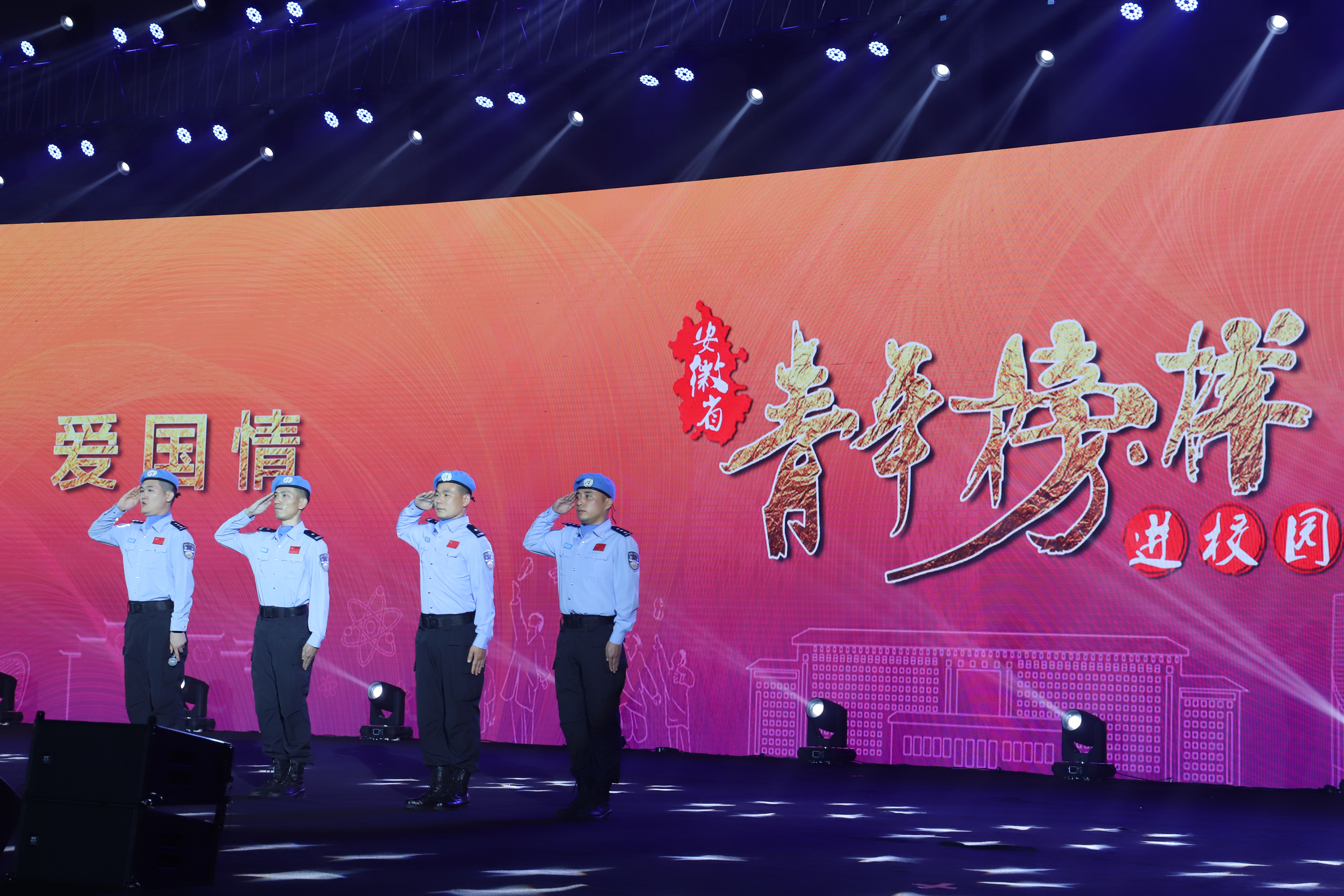 在“爱国情”环节,伴随着视频介绍,中国 (安徽)第七支赴南苏丹维和警队的队员们来到现场,讲述在南苏丹执行维和任务时的艰苦条件和危险经历,展现中国维和警队不惧危险、不怕牺牲、思想过硬、作风过硬、业务过硬的形象。
