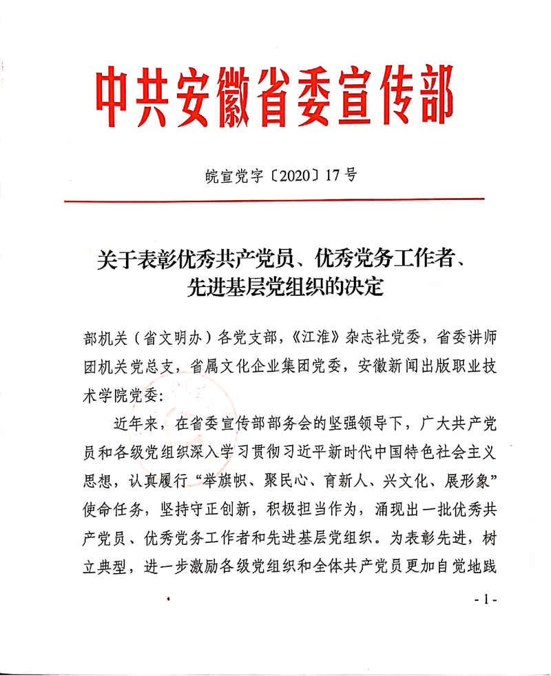 江淮杂志社强昌洋、冉然、刘利、陆迪四人表彰为优秀共产党员,政治理论部党支部表彰为先进基层党组织。