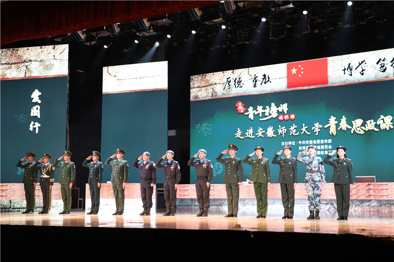 最后,路丙辉做课堂总结。青年榜样、安徽师范大学合唱团学生代表上场,全体观众共同合唱《我和我的祖国》,全场挥舞着小红旗,齐声歌唱,为思政课画上圆满句号。除“青春思政课”专题活动外,此次进校园还注重开展延伸活动,举办了“不忘初心 牢记使命”安徽青年运动百年回眸图片展,并以“青春分享会”的形式,邀请部分青年榜样走进学生中开展微宣讲,巩固和强化了教育效果。