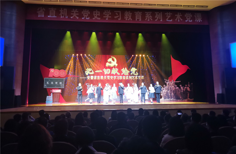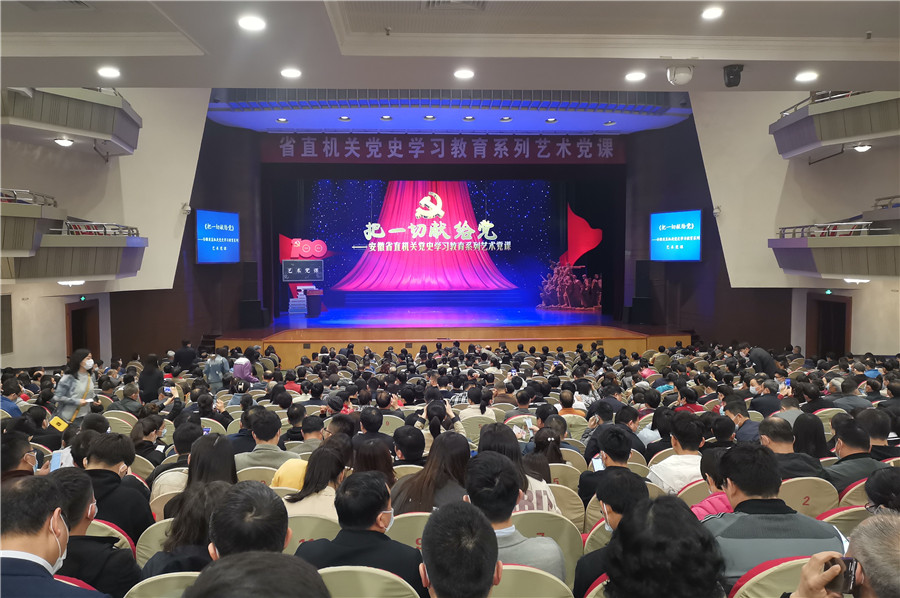 本网讯(记者 史洪芳)4月16日上午,《把一切献给党》——安徽省直机关党史学习教育系列艺术党课主题歌舞演出在安徽大剧院上演。全场坐无虚席,1000余名党员干部职工观看演出。