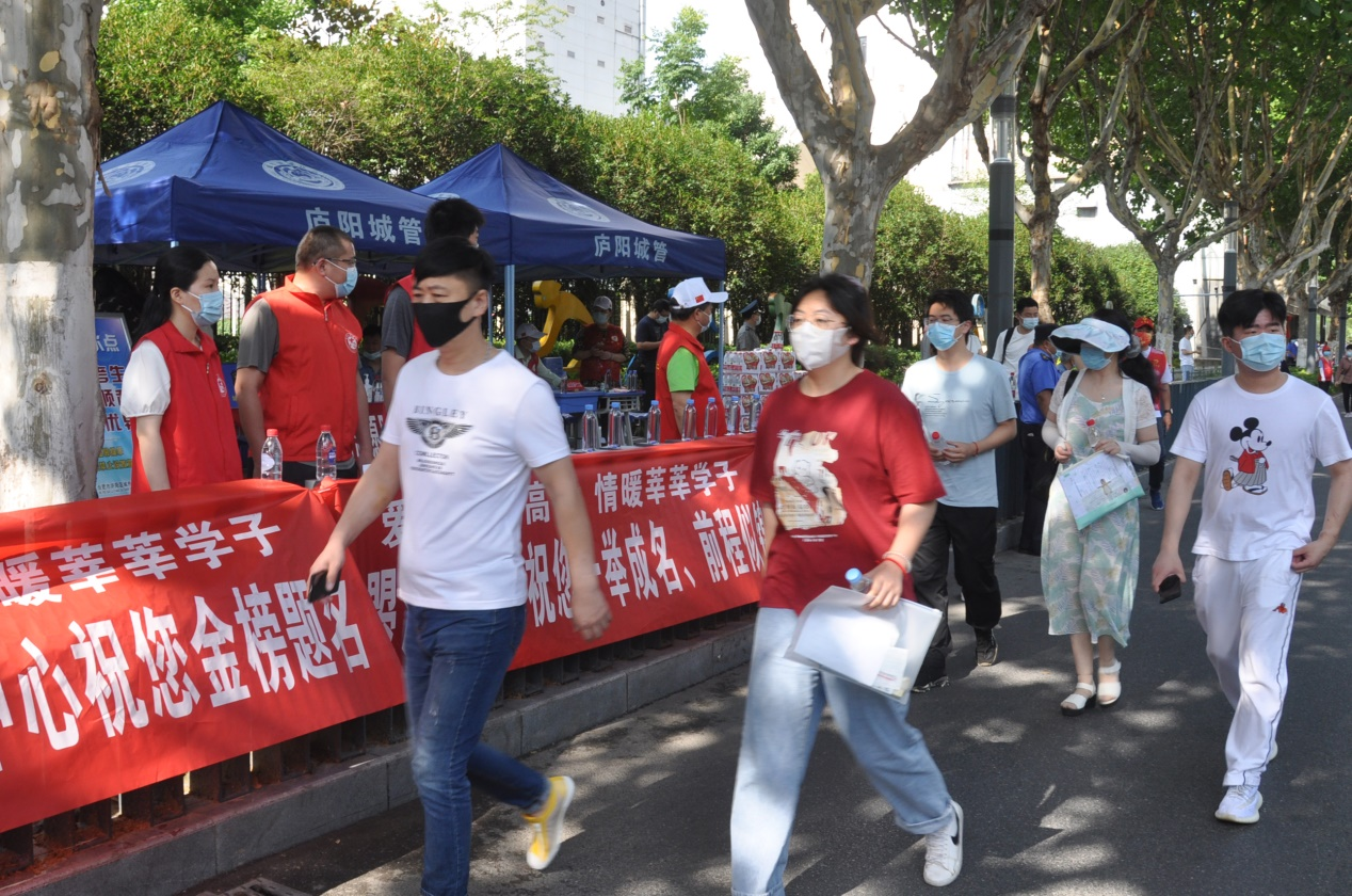 在合肥九中考点,江淮杂志社志愿者帮助交警维持交通秩序,引导考生有序入场,指引家长在等候区休息,并免费为考生和家长提供矿泉水、口罩等防疫防暑降温用品。