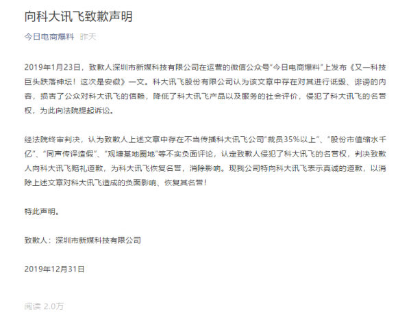 判决后,深圳市新媒科技有限公司在其运营的公众号“今日电商爆料”向科大讯飞道歉:“现我公司特向科大讯飞表示真诚的道歉,以消除上述文章对科大讯飞造成的负面影响、恢复其名誉!”