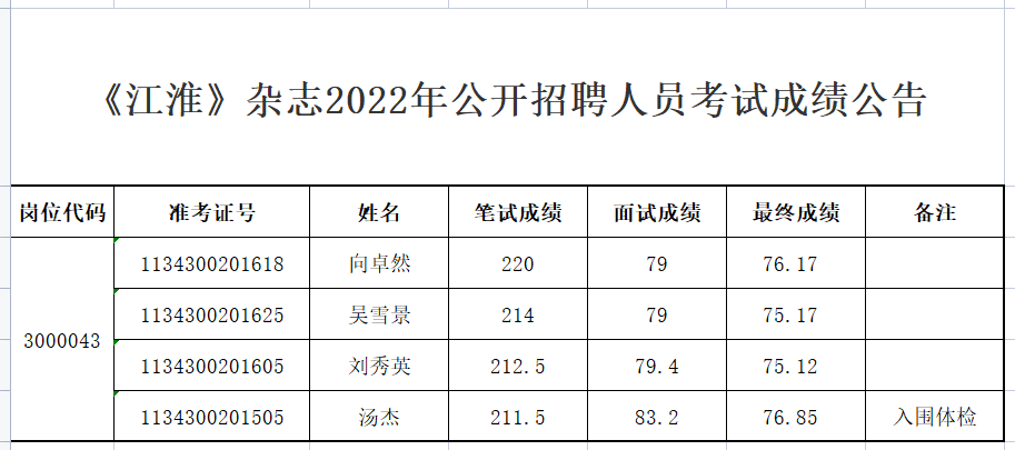 《江淮》杂志2022年公开招聘人员考试成绩公告