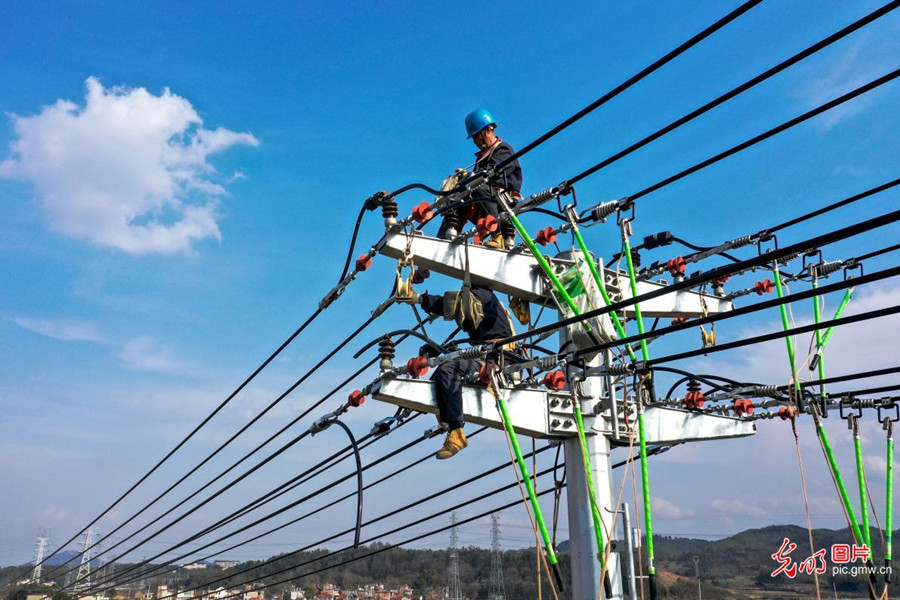 2019年3月14日,为保障农业生产用电安全,安徽省庐江县供电公司组织210名党员组成18个"春耕保电服务队",深入镇村田间地头,检修农灌线路。(左学长摄/光明图片)