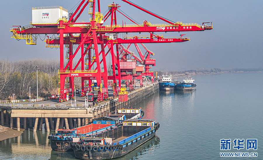 近年来,郑蒲港新区充分发挥其在长江经济带的区位优势,整合长江航运、公铁水多式联运等中转和运输功能,着力打造安徽江海联运枢纽中心,“区港联动”“铁水联运”成效初显。新华网发(王文生 摄)