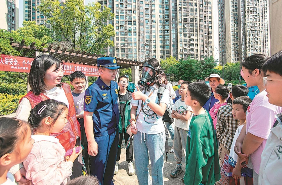 5月11日,在滁州市南谯区东坡社区和顺东方花园居民小区,南谯区消防救援局指战员在指导居民和孩子们灾害发生时如何正确使用正压式空气呼吸器。
