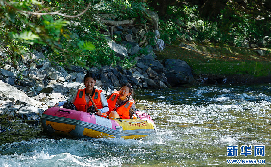 当日是小暑节气,众多游客来到安徽省黄山市休宁县夹溪河体验漂流,亲水玩耍,畅享清凉。新华网发(施亚磊 摄)