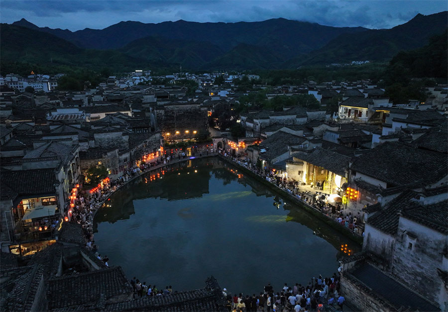 当日晚,在安徽省黄山市黟县宏村,“月沼乐夜”公益音乐会浪漫上演。来自中国音乐学院“美育浸润徽韵扬 非遗传承青年行”实践团的22名师生,通过声乐舞蹈、器乐演奏的方式,演绎了《春江花月夜》等经典曲目。动人旋律在粉墙黛瓦间流转,于千年月沼水面轻漾,在夏夜古村奏响一曲“星空乐章”,吸引众多游客沉醉其中,助力古村夏日夜经济。新华网发(施亚磊 摄)