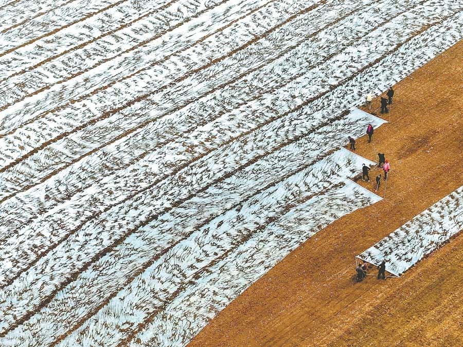 12月20日,在“药材之乡”亳州市,药农们忙着为中药材白芷培土保墒、覆盖地膜,为药材增产增收打基础。通讯员 刘勤利 摄