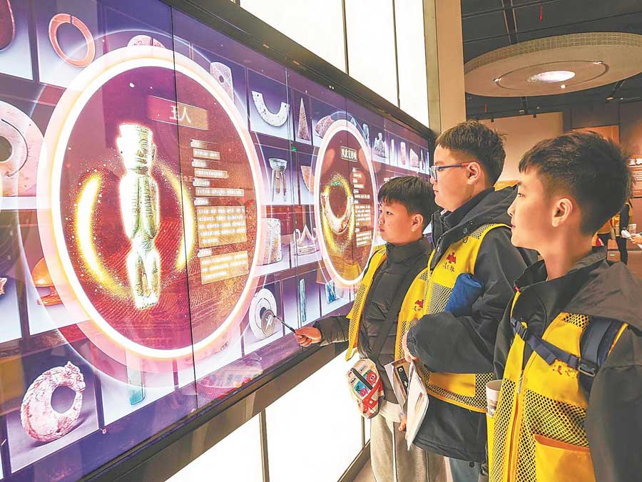 3月21日,马鞍山含山县凌家滩国家考古遗址公园,学生通过互动平台了解凌家滩五千年历史文化的独特魅力。本报通讯员 张道平 琚娟娟 摄