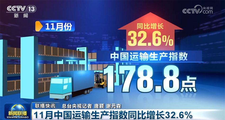 交通运输部科学研究院今天发布,11月份,中国运输生产指数为178.8点,同比增长32.6%。其中,货运指数为211.2点,同比增长12.9%,增速较10月份加快1.7个百分点。钢铁、粮食、煤炭等货运量有所增长。客运指数为89.1点,同比增长143.2%。