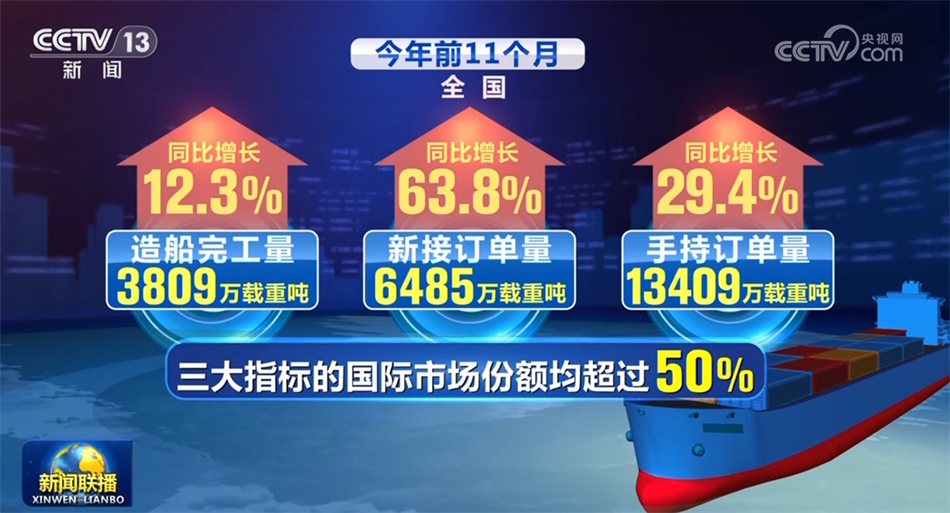 记者从工业和信息化部获悉,今年前11个月,全国造船完工量、新接订单量、手持订单量,分别达到3809万载重吨、6485万载重吨、13409万载重吨,同比分别增长12.3%、63.8%、29.4%,保持快速增长的同时,三大指标的国际市场份额均超过50%。