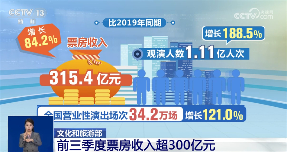 文化和旅游部相关负责人介绍,今年前三季度,全国营业性演出场次34.2万场、票房收入315.4亿元、观演人数1.11亿人次,比2019年同期分别增长121.0%、84.2%、188.5%。