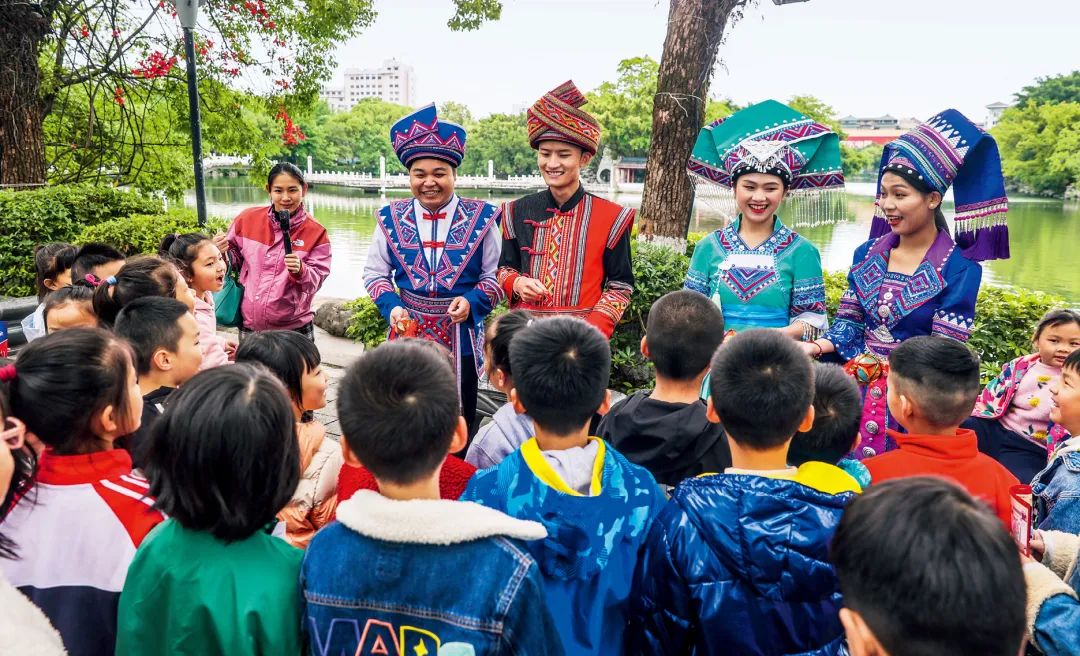 2023年4月25日,广西桂林,“网络法治宣传一条街”在榕湖景区古南门“开街”,身穿民族服装的工作人员演唱山歌向青少年普及网络法治知识。