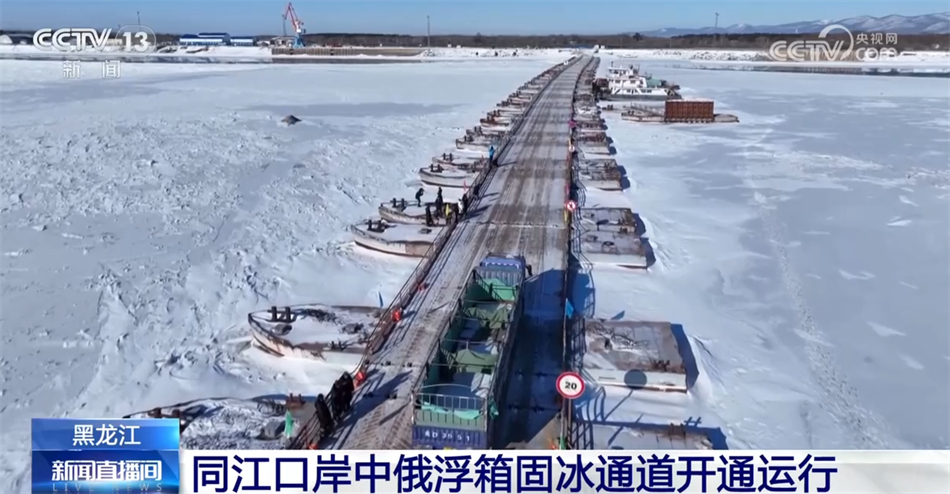 中俄浮箱固冰通道是为保障冬季中俄国际道路运输车辆安全运行的冰上国际运输通道。26日,黑龙江省同江市至俄罗斯下列宁斯阔耶口岸2023年冬季至2024年春季冰封期中俄浮箱固冰通道正式开通运行。