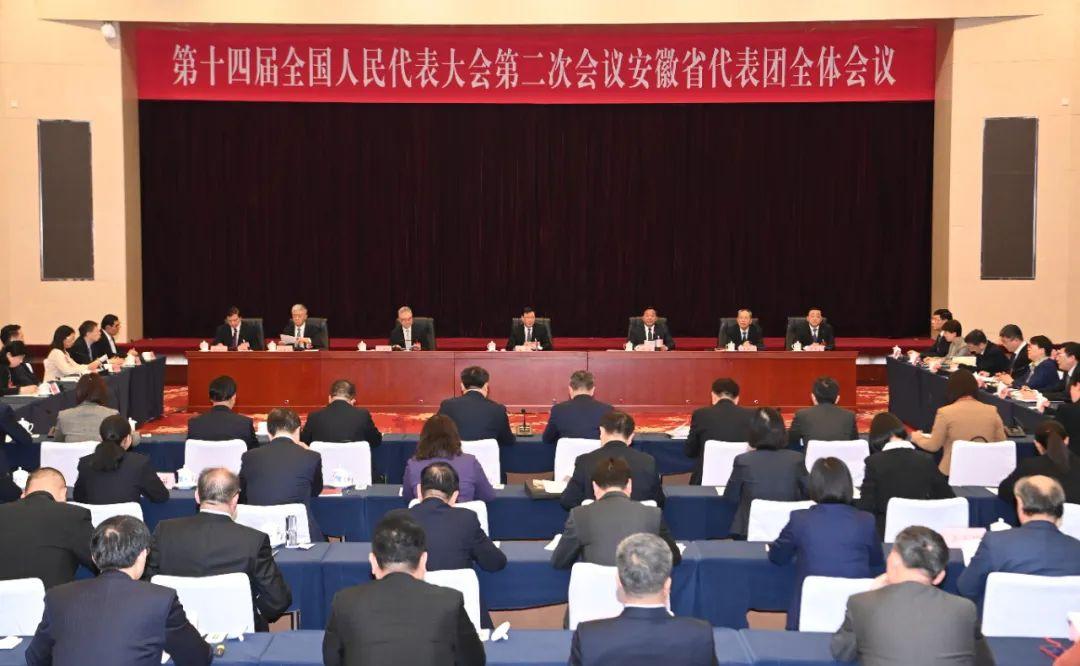 3月3日下午,出席第十四届全国人民代表大会第二次会议的安徽代表团在北京成立,并举行全体会议。省委书记、省人大常委会主任韩俊主持会议并讲话。
