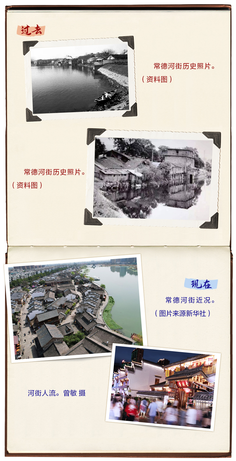 “大河街的金子,小河街的银子,麻阳街的痞子。上南门高,下南门低,银子出在河街里。”这句流传于常德民间的谚语,形象生动地诠释了早期河街浓郁的商业氛围和市井生活气息。新中国成立后,水上运输逐渐被现代交通工具所取代,河街曾经的风光也随之没入跌宕起伏的历史长河。2016年,常德市复原老河街风貌,建成以老常德时期河街为原型的常德河街。2022年,常德河街获评国家级旅游休闲街区、国家级夜间文化和旅游消费集聚区。