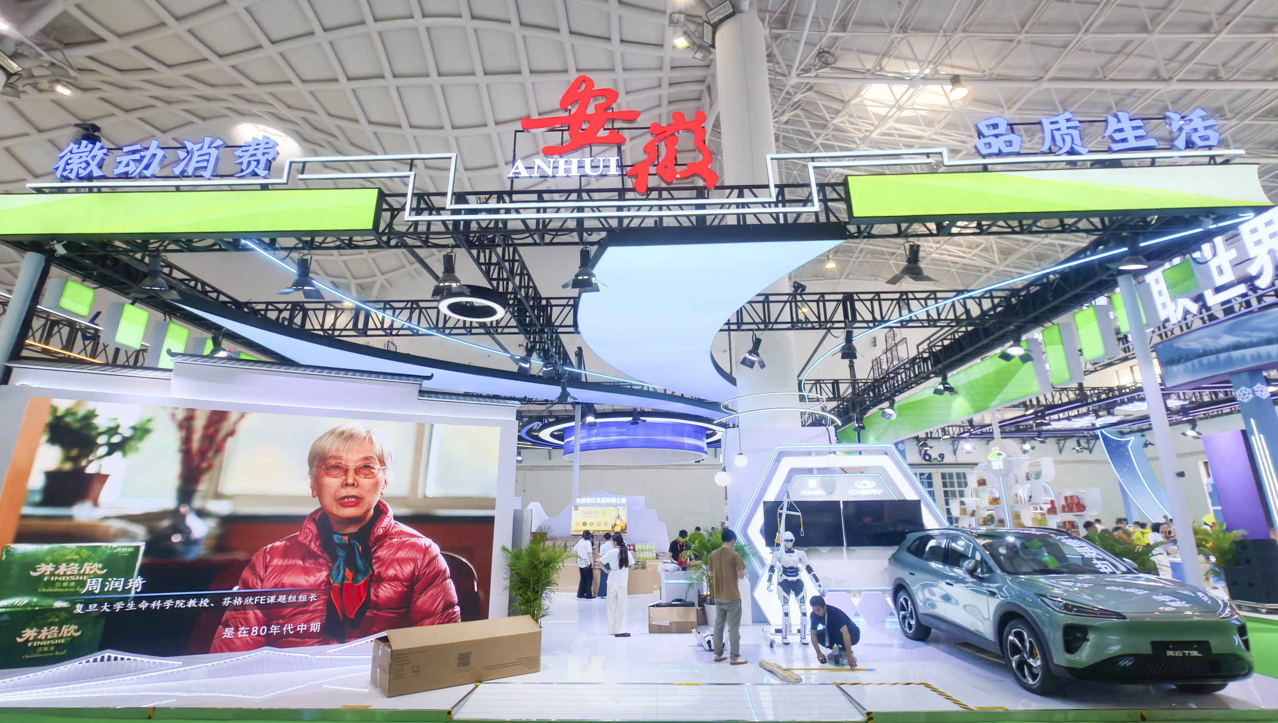 在机器人一旁,奇瑞汽车风云T9L以硬朗的线条和科技感十足的内饰,展现了安徽在汽车制造领域的成就。