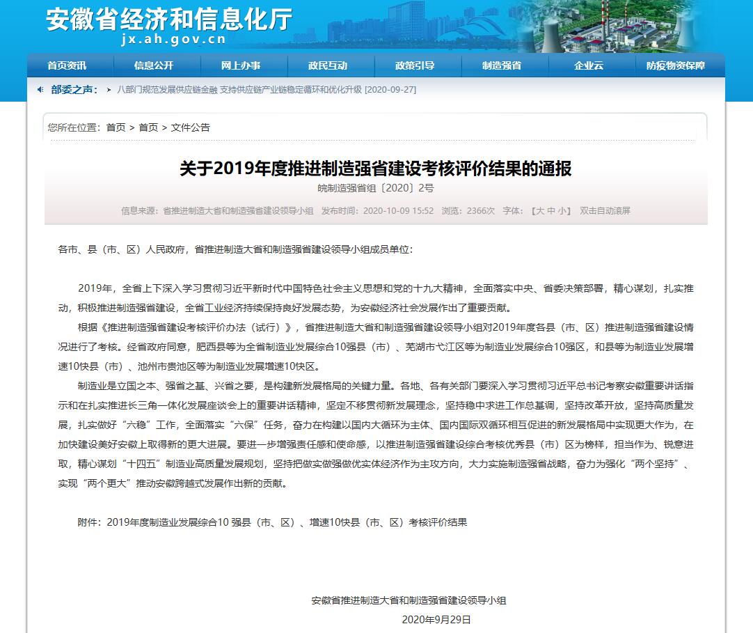 根据《推进制造强省建设考核评价办法(试行)》,省推进制造大省和制造强省建设领导小组对2019年度各县(市、区)推进制造强省建设情况进行了考核。经省政府同意,肥西县等为全省制造业发展综合10强县(市)、芜湖市弋江区等为制造业发展综合10强区,和县等为制造业发展增速10快县(市)、池州市贵池区等为制造业发展增速10快区。