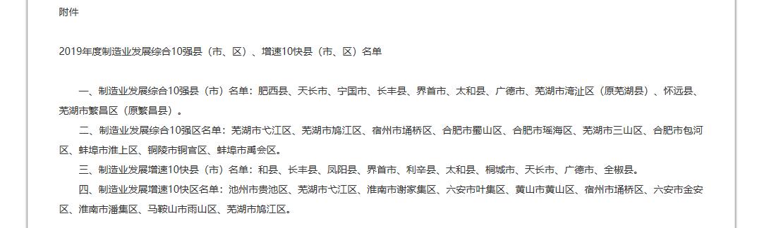 三、制造业发展增速10快县(市)名单:和县、长丰县、凤阳县、界首市、利辛县、太和县、桐城市、天长市、广德市、全椒县。