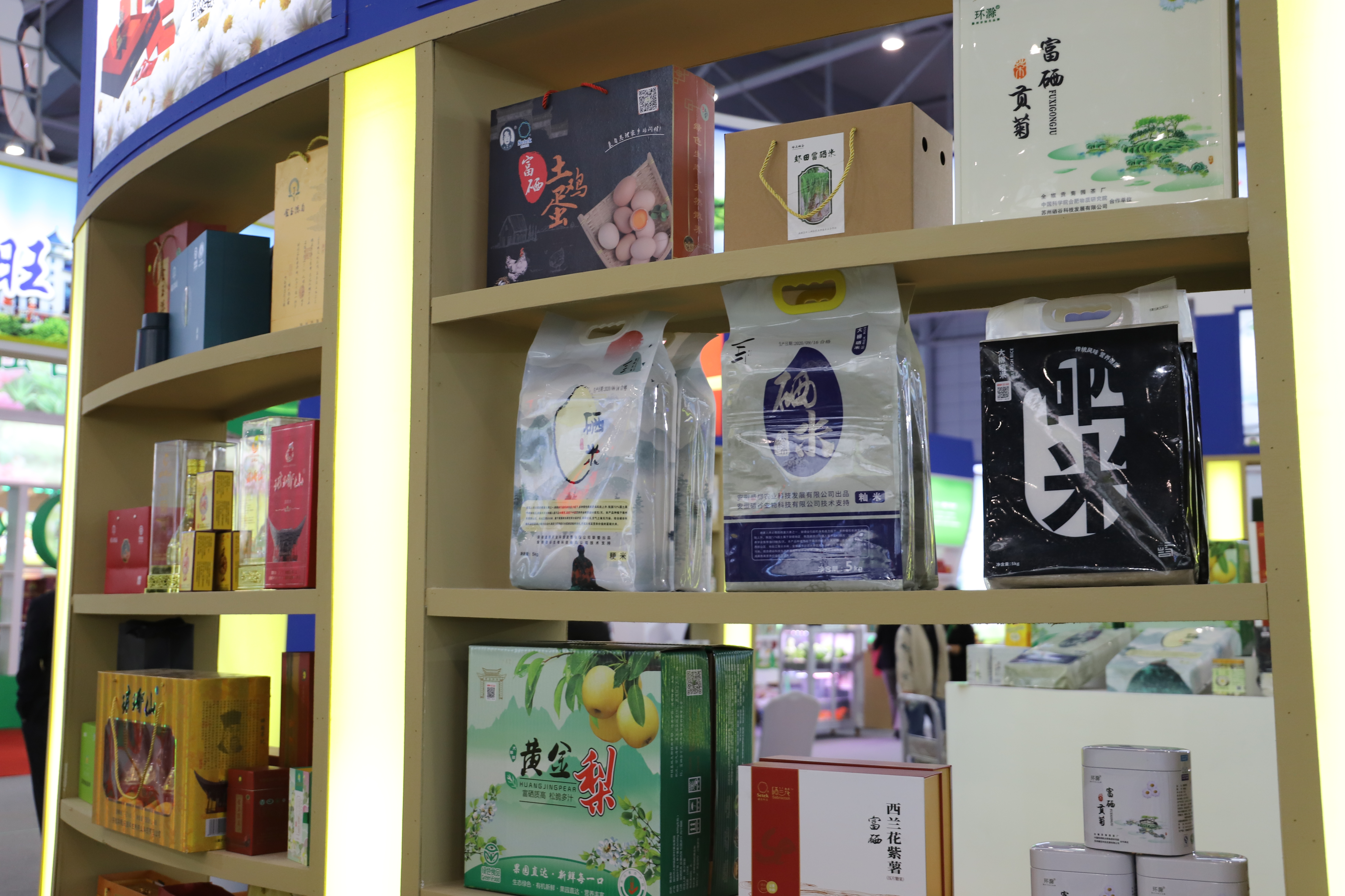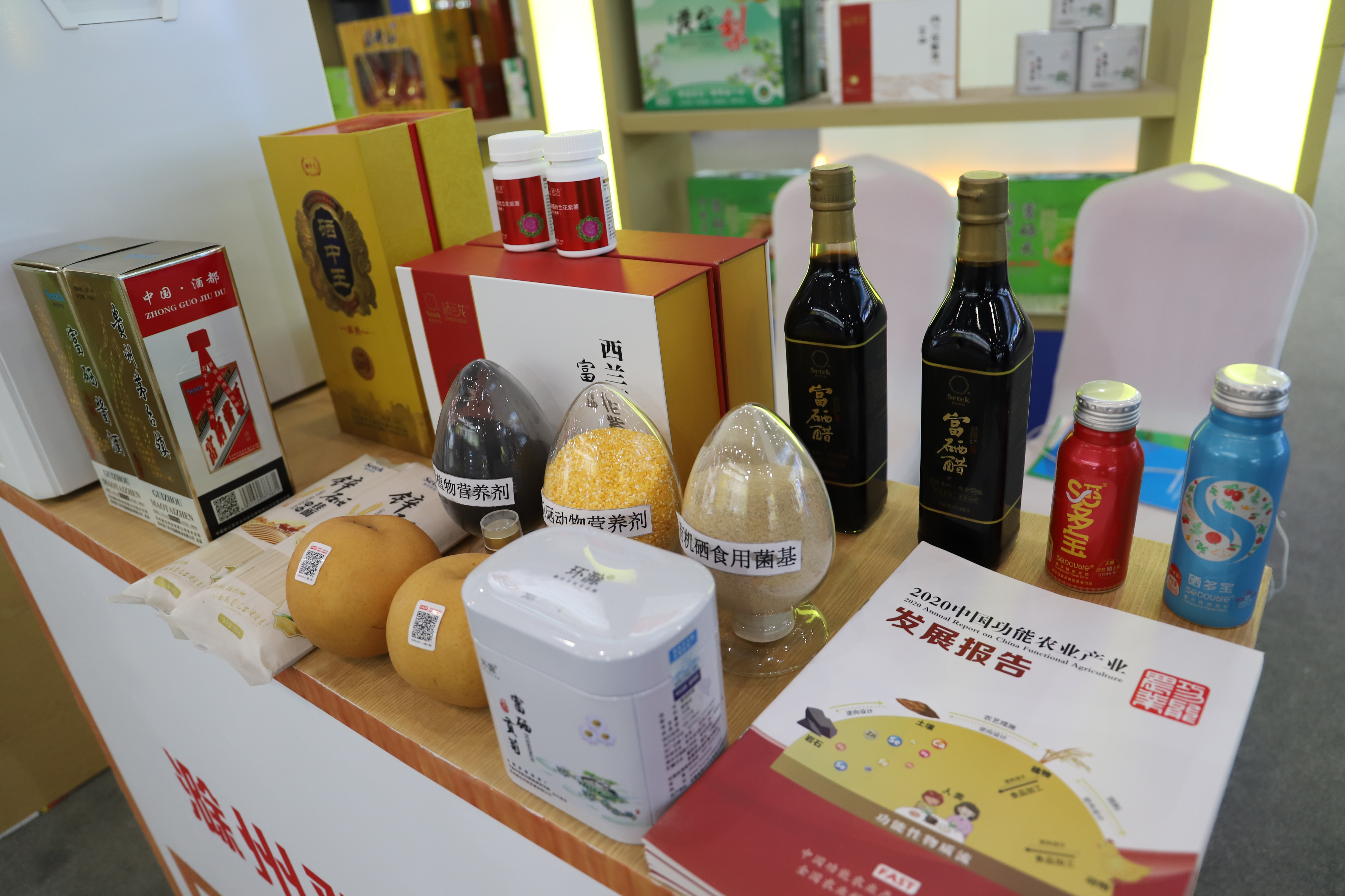 在滁州展厅的一个不起眼的角落,展台上展品与众不同,一个个玻璃瓶中装着有机硒植物营养液、有机硒动物营养液、有机硒食用菌基等。此外,还有醋、西兰花、贡菊、土鸡蛋、紫薯、大米等。“我们在做的是功能农业,能生产出富含有益健康成分的农副产品,有效满足人们“吃出健康”的新需求,现在展出的这些都是富硒农产品。”安徽硒谷生物科技有限公司陆晓奇介绍。