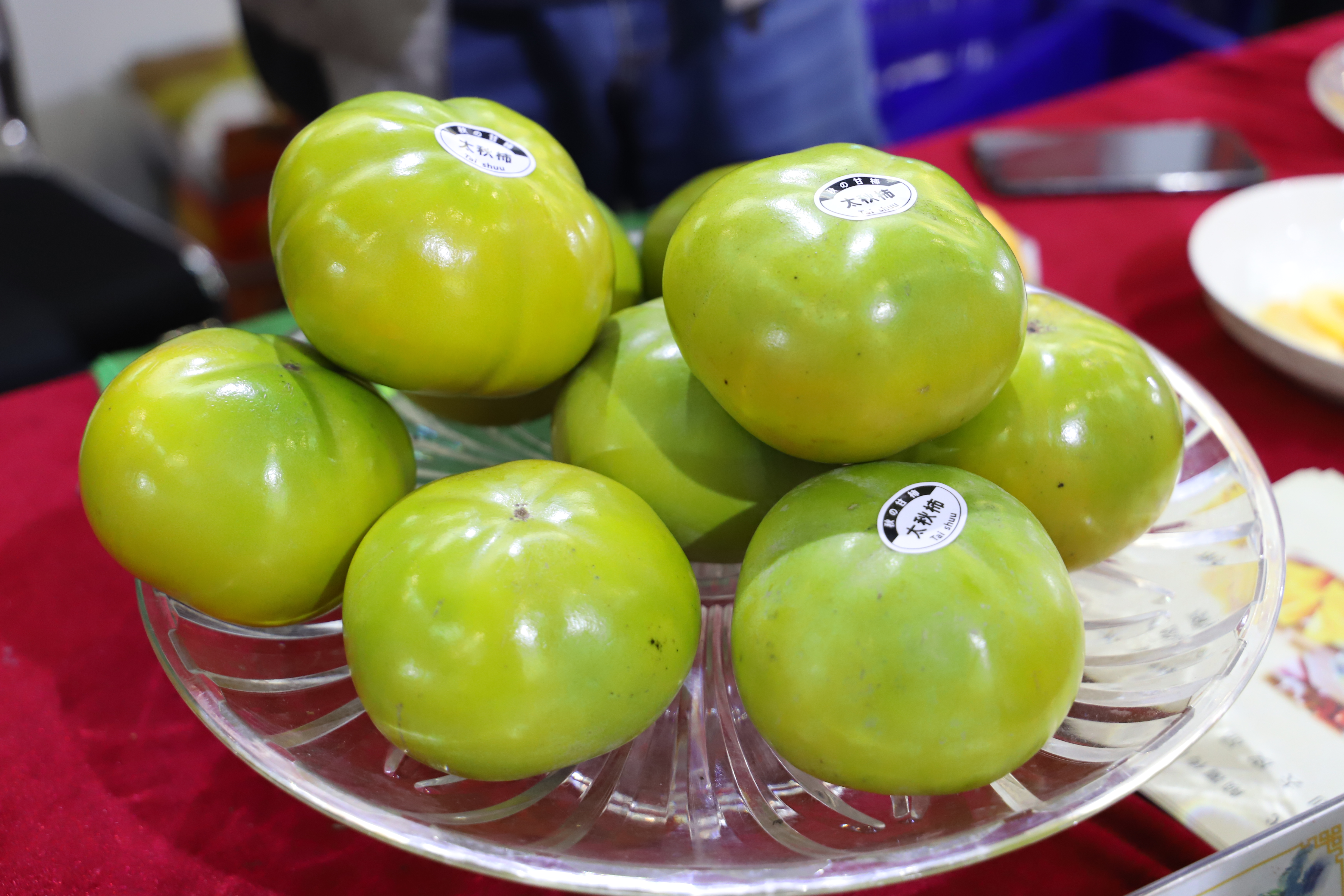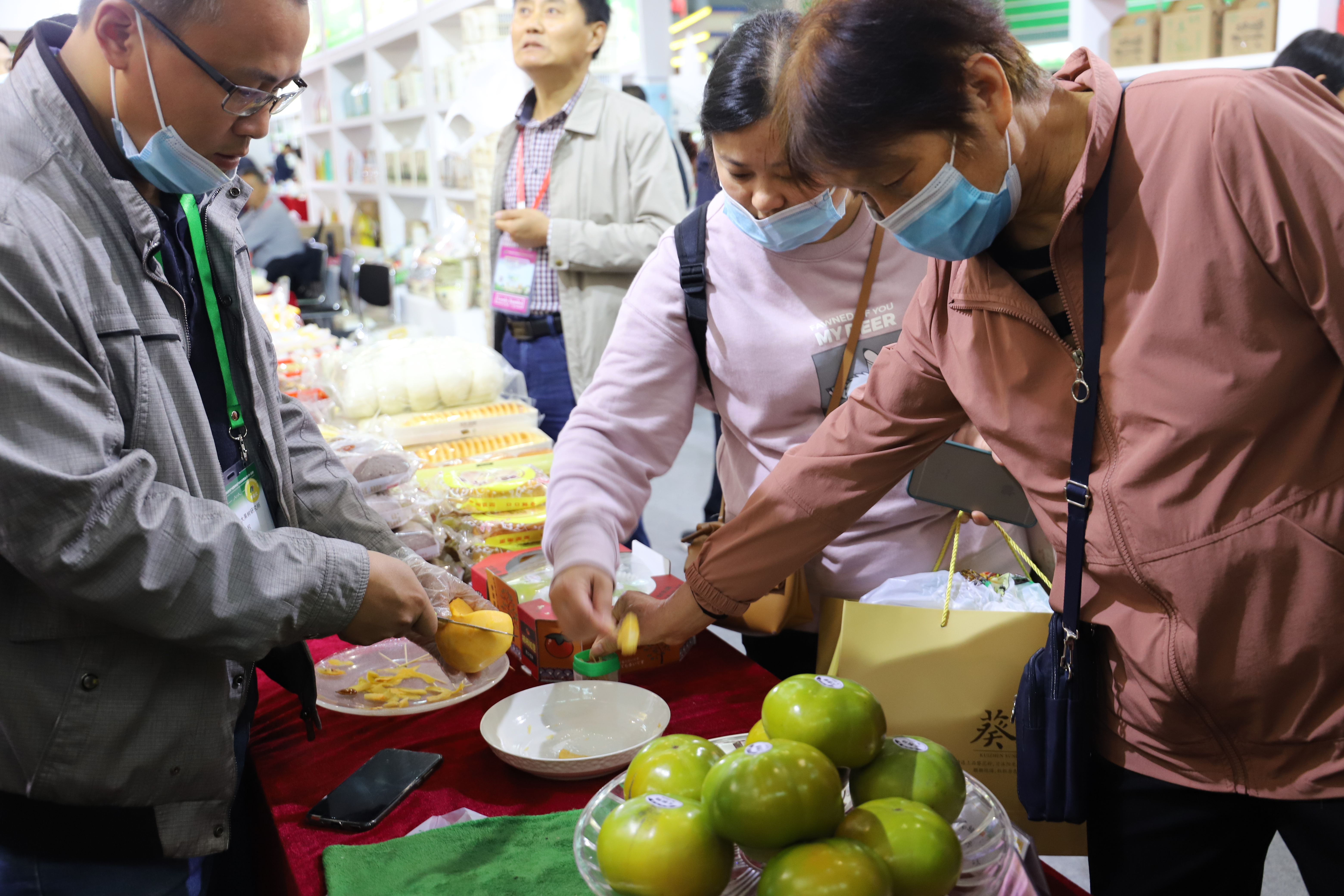 人们在一盘绿莹莹的水果前驻足不前,好奇不已。“这是太秋甜柿,刚研究出的新品种,直接从树上摘下来就能吃,不必经过任何处理,可甜了”。合肥市果祖农业有限公司工作人员面对询问这样介绍道,“每个柿子有七八两重,50元一斤。”据介绍, 这种甜柿拥有陕西泾阳县北塬种植合作社、合肥市正大果树研究所两大基地,目前正以跟踪服务、果园代建、联合建园三种合作模式面向大众。安徽龙润堂生物科技有限公司的展台上看不到梨的身影,只有一些有着显著中国风包装的产品。正如其自称的“始于梨 行于梨 创于梨”,这是一家专注于酥梨深加工生产的企业,已有明星产品极梨膏、酥梨饮、润润糖等,在以往的直播中大受追捧。