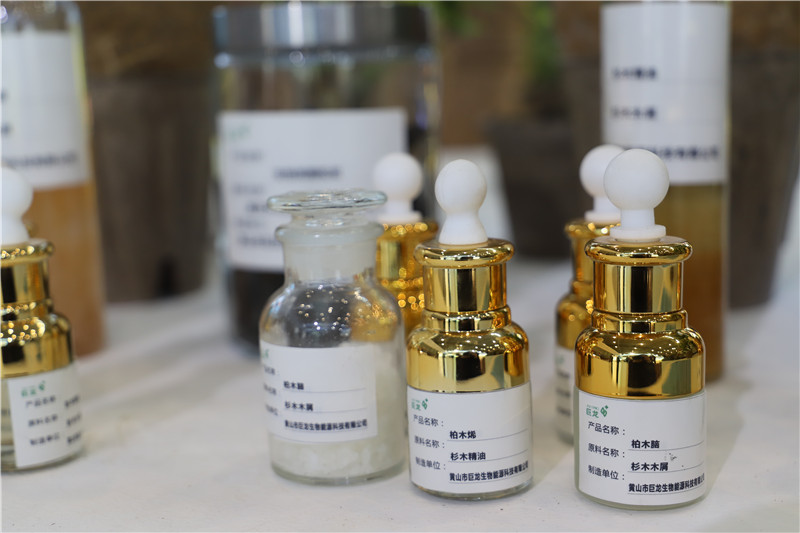 黄山市展厅内,一个玻璃瓶正散发着阵阵清香,显得尤为特别。这是由巨龙生物能源科技有限公司生产的杉木精油,“杉木精油是从杉木屑中提取出来的,从精油中能分离出柏木醇、柏木烯等香料。”其公司副总经理曹红霞介绍。分离出来的香料还可以再深加工,用来生产香皂、香水等日用品。除此之外,公司还生产和经营生物颗粒燃料、机制木炭、活性炭等产品。其中,生物颗粒燃料的原料来自于农作物秸秆、废弃菌棒、杉木屑,其热值很高,但碳排放量却很低,对环境污染较少。