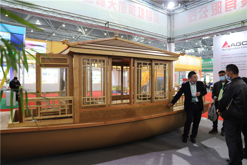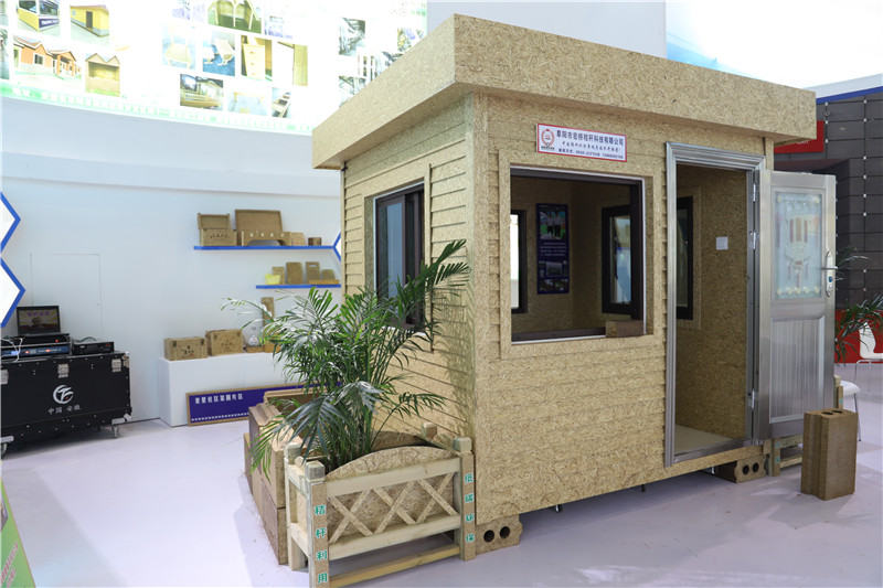 矗立在展馆内的一座别致房屋吸引着观众们驻足。阜阳市宏桥秸秆科技有限公司总经理张中成介绍,房屋是由秸秆砖和秸秆板材制造而成,墙体厚度为10公分,使用寿命不低于50年,低于市场常规房屋价格的30%左右。秸秆砖和秸秆板材重量相当于水泥砖的三分之一,具有阻燃、抗震、防晒隔热、抗严寒等功能,强度高且可重复利用,可建成导游亭、环保公厕等。除此之外,在展馆其他位置也散落着一些秸秆产品,一座蓝白相间的治安岗亭、一艘用于乡村旅游的游船,以及椅子、课桌、花卉栏等等,产品类型多样且实用。