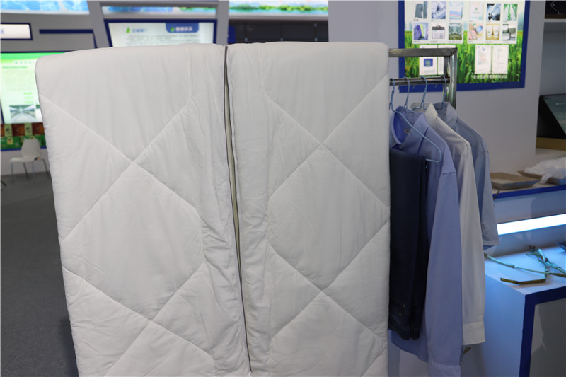 蚌埠展厅内,放置着衬衫、T恤等衣物以及被子、四件套等床上用品,摸起来光滑舒适。“这些衣服被子真是用秸秆做的吗?咋能做出来?”一位观众不解地问道。安徽丰原生物材料股份有限公司的现场工作人员介绍,这些都是由聚乳酸纤维制作而成。聚乳酸纤维俗称“玉米纤维”,采用玉米纤维制成的面料,具有与人体肌肤相近的弱酸性,天然亲肤、抑菌、抗螨,具有良好的悬垂性、导湿透气性、富有光泽和丝滑感,以及抗紫外线功能,应用于内衣、运动休闲服饰、床品制作中具有显著优势。