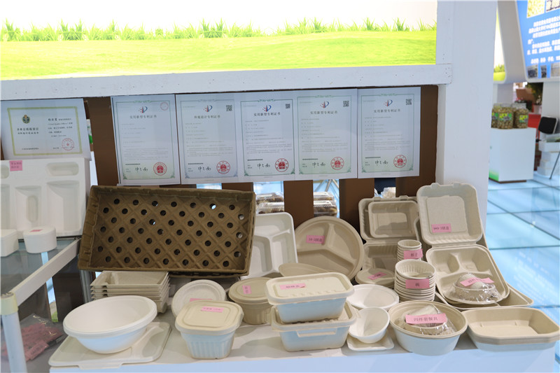 北京秸缘五洲商贸有限公司生产的餐具琳琅满目,在展馆内异常显眼。据现场工作人员介绍,这些餐具是利用秸秆等天然植物纤维可再生性生物高分子原材料制作而成,除餐具外,还有酒店用品、生活日用品等秸秆环保制品。产品远销英国、美国、俄罗斯、韩国、瑞士、荷兰等世界上28个国家和地区,被全球“Material ConnecXion”机构作为一种新型材料产品收录,可替代塑料、玻璃、陶瓷、竹、纸等传统材料,安全健康。