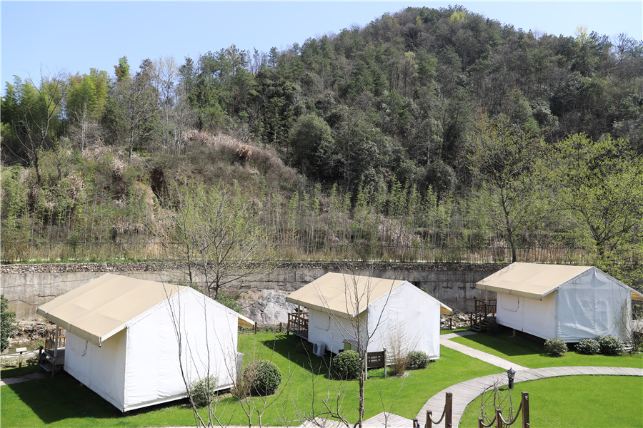 泡完温泉,可以选择入住清幽静雅的伴山温泉帐篷酒店。这里偏居一隅,有20顶全国首家全软布帐篷,通过一架吊桥与外界隔开,背依千亩竹海,面临清泉汩汩。春日阳光下,白色帐篷错落有致地排列着,与四周的绿树青草相互映衬。当你在山林入眠,在山野鸟语虫鸣声中醒来,倍感惬意与安宁。