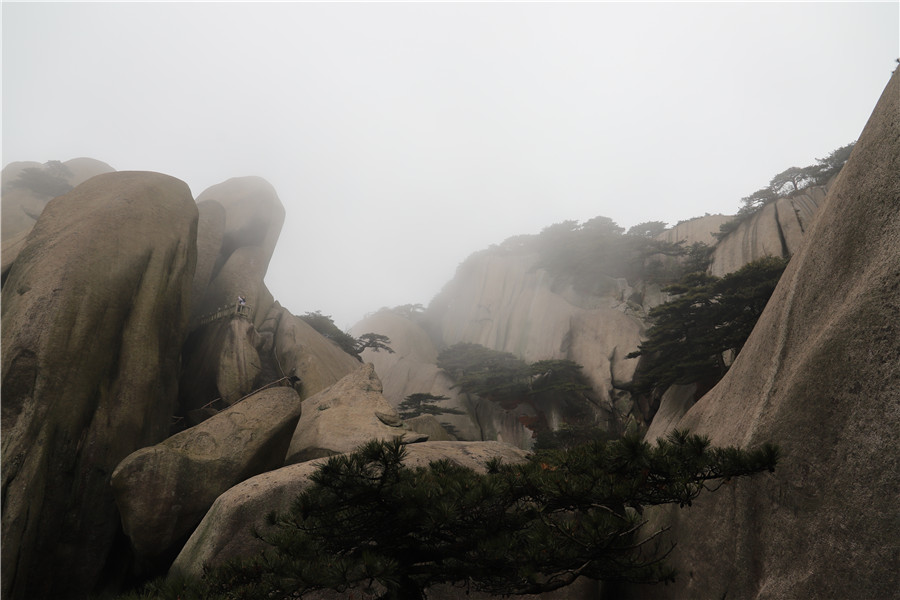俗语曰:“人到桥头皆是仙。”海拔1426米的天池峰一裂为三,由两段石条连接在一起,这便是著名的“渡仙桥”。站在天池峰顶,可遥望天柱山第一高峰——天柱峰。天柱峰海拔1489.8米,凌空耸立,一柱擎天,嶙峋奇绝,瑰伟秀丽,如锥如炬又如剑。诗仙李白曾作诗赞曰:“清冥皖公山,巉绝称人意。”白居易奇道:“天柱一峰擎日月,洞门千仞锁云雷。”