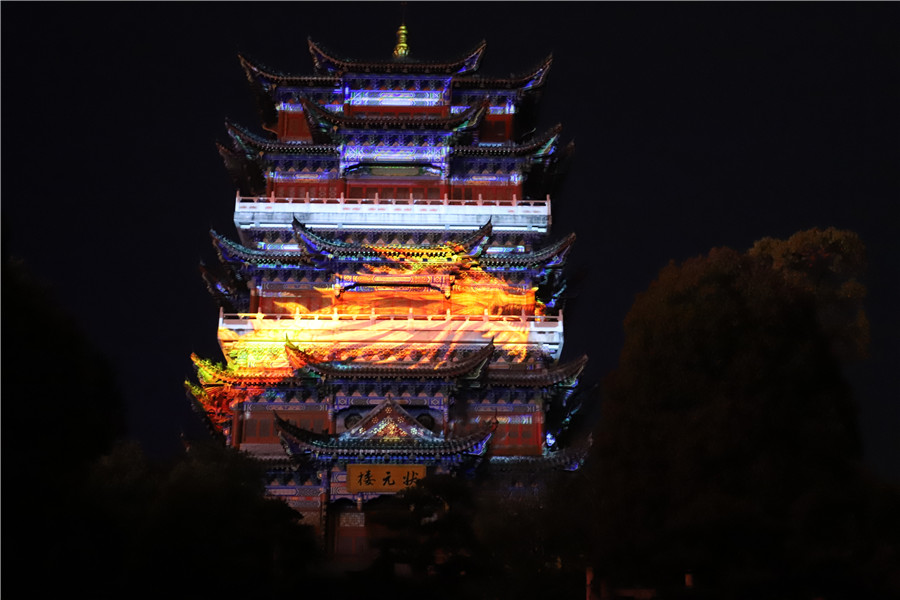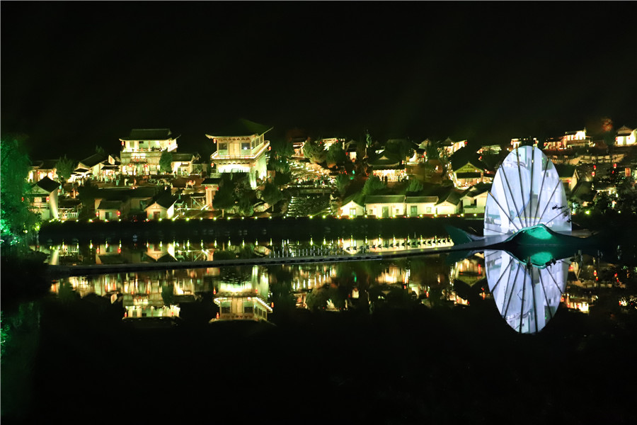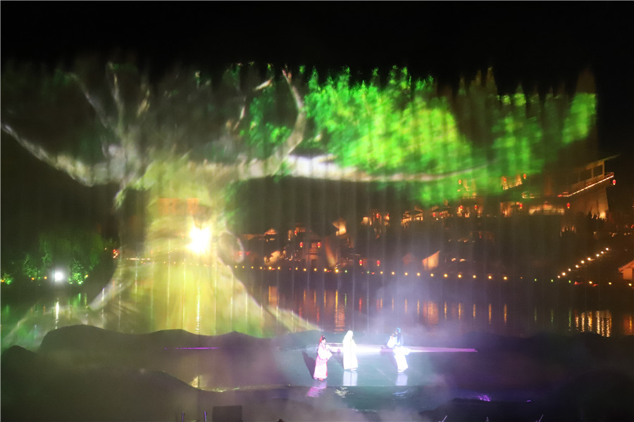 在这里,游客可以体验奇妙的夜游之旅。除了一“剧”《天仙配新传》之外,还有一“秀”——裸眼5D楼体激光秀《梦回晋熙》,将戏曲、禅宗、特色地域文化等元素图案在状元楼上不停变换,配合音乐,赋予游客视觉和听觉的双重震撼。以及一“景”——《四季夜泊》,依靠状元楼和榜眼楼之间的水池、石船,通过光影技术呈现湖面景观唯美浪漫的四季变化,流光溢彩。